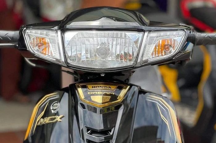 Headlamp yang berbentuk persegi panjang dan lampu seinnya masih menyatu dengan bagian setang. Honda ini terlihat lebih eksklusif karena ada aksen emas yang diguratan di bodi Honda Dream 125 2022 ini.
